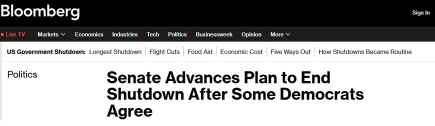 FX168财经报社(亚太)讯 美国彭博社周一(11月10日)最新报道称,在一批温和派美国民主党人打破党派立场、投票支持结束这场破纪录政府停摆的协议后,美国参议院朝着重新开放政府的方向迈出关键一步。