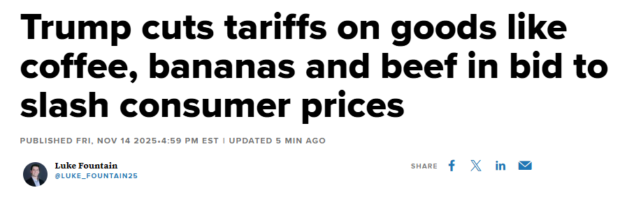 FX168财经报社(北美)讯 美国总统唐纳德·特朗普(Donald Trump)周五(11月14日)宣布,将豁免包括咖啡、可可、香蕉及部分牛肉在内的关键农业进口产品的高关税,以应对美国民众对食品杂货价格持续上涨的不满。这标志着特朗普在贸易政策上的一次罕见逆转,也反映出白宫在食品价格压力面前的政治考量。