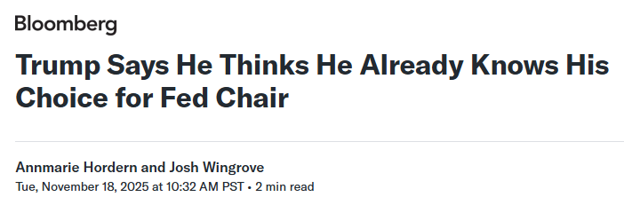 特朗普透露,他已经“基本确定”下一任美联储主席的人选。财政部长斯科特·贝森特(Scott Bessent)正在主导遴选程序,并确认将在未来几周与最终候选人会面,预计将在年底前向总统提交推荐名单。