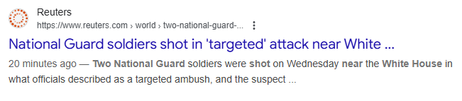 据悉,两名国民警卫队队员在白宫以西仅数百米的Farragut West地铁站附近遭枪击,伤势被描述为“危急(critically wounded)”,目前分别被送往两家医院救治。