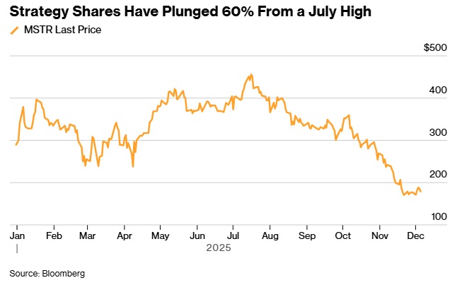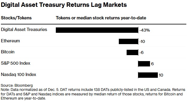 有些“数字资产财库”比较走运,市值仍高于其所持基础资产的价值;但根据彭博社的测算,大多数“数字资产财库”对那些在接近高点时买入的人来说都是亏损的,而且约70%的“数字资产财库”预计将以低于年初水平的价格收官。