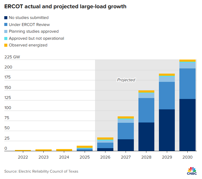 与此前占主导地位的比特币矿业不同,AI数据中心需要全天候、不可中断供电,单体项目用电规模往往超过1吉瓦,这也使其对电网稳定性提出更高要求。ERCOT数据显示,2025年新增大型用电申请中,约73%来自AI相关项目,比特币矿业已明显退居次要位置。