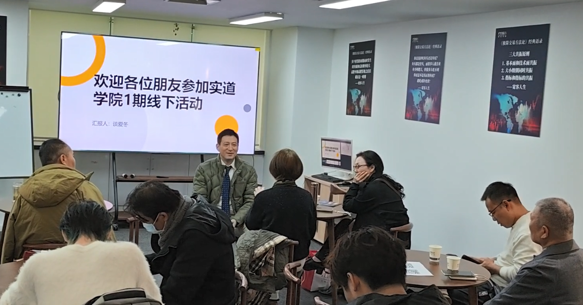 活动伊始,实道学院谈院长,以务实行稳开场,向到场的朋友致以诚挚欢迎。他简要介绍了学院成立以来的发展:从课程体系的搭建,到实战案例库的完善;从线上直播,到线下沙龙,学院始终以“培养具备全球视野的投资者”为使命,通过系统化教学与前沿市场研究,助力学员在复杂行情中把握确定性机会。