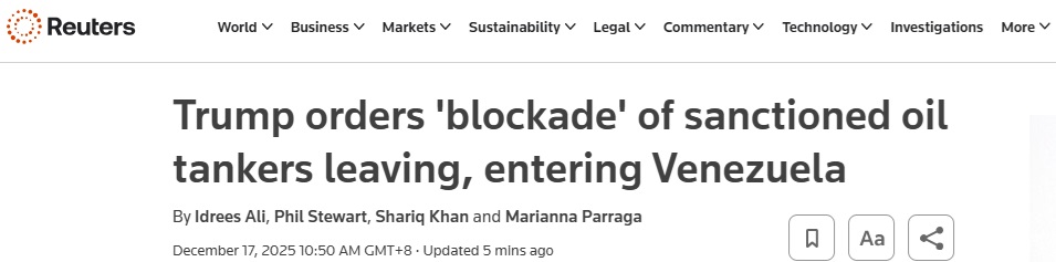 石油市场参与者表示,油价上涨是因为市场预期委内瑞拉出口可能减少。不过,市场仍在观望特朗普的“封锁”将如何执行,以及这一措施是否会扩大到涵盖未受制裁的船只。