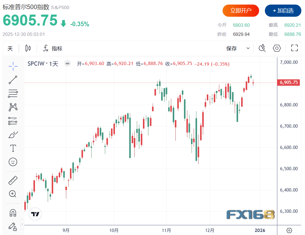 FX168财经报社(北美)讯 在标普500指数上周刷新历史纪录后,美股周一出现回调,科技板块走弱成为拖累因素。与此同时,贵金属市场波动加剧:白银在隔夜首次触及80美元/盎司后迅速跳水,日内回落逾6%。本周宏观数据相对清淡,市场关注焦点转向周二公布的美联储12月会议纪要,投资者希望从中寻找2026年货币政策路径的更多线索。