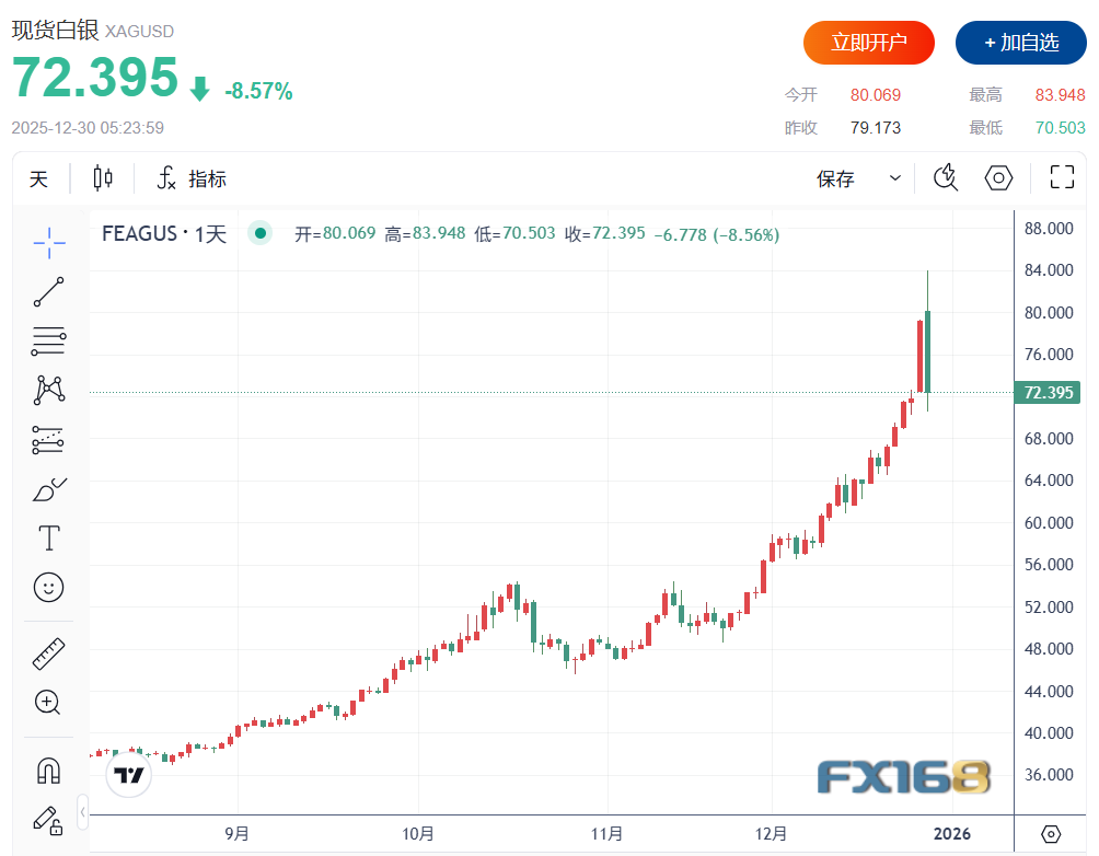 白银在2025年末强势冲高后迎来剧烈震荡。周一,白银期货隔夜一度突破80美元/盎司,创历史新高,但随后快速回落,尾盘仍下跌超8%,最新交投于72.395美元/盎司附近。