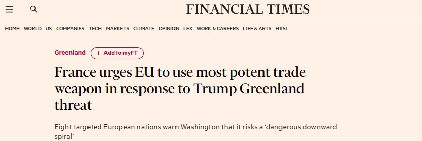 FX168财经报社(亚太)讯 英国《金融时报》周日(1月18日)报道称,法国总统马克龙(Emmanuel Macron)呼吁欧盟在美国总统特朗普(Donald Trump)威胁、将因格陵兰争端对多个欧洲国家加征关税后,启动针对美国的最强有力贸易武器。