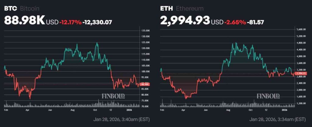 尽管如此,毫无疑问,比特币的表现更好,因为在新闻发布时,其价格为88,983美元,远高于2021年接近67,000美元的高点,尽管仍大幅低于2025年底接近125,000美元的水平。另一方面,以太坊的价格为2,994美元,低于2025年、2024年和2021年的所有高点。