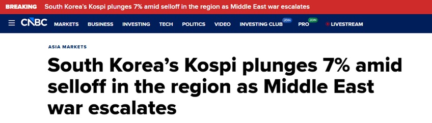 FX168财经报社(亚太)讯 周三(3月4日)亚市早盘,韩国股市暴跌,延续前一日的急剧抛售。此前韩国股市基准指数录得19个月以来最差单日表现,而中东战争持续升级加剧了市场动荡。