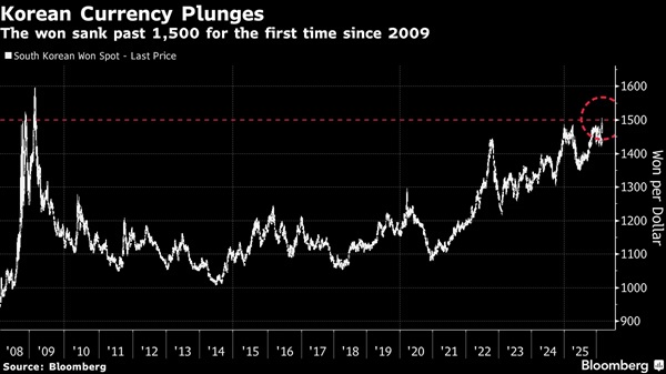 韩元隔夜兑美元一度跌破1,500关口,为2009年春季以来首次。尽管周三上午稍晚回升并在1,481附近交投,但其他市场指标仍显示剧烈波动:韩国股市触发熔断机制。