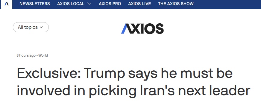 #伊朗危机追踪#FX168财经报社(亚太)讯 美国知名新闻网站Axios当地时间周四(3月5日)发布独家报道称,美国总统特朗普(Donald Trump)周四在一次采访中对Axios表示,他需要亲自参与挑选伊朗的下一任领导人——就像他在委内瑞拉那样。