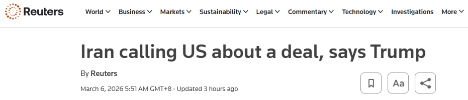 #伊朗危机追踪#FX168财经报社(亚太)讯 英国路透社周五(3月6日)最新报道称,美国总统特朗普(Donald Trump)当地时间周四表示,在美国和以色列对伊朗发动空袭的背景下,德黑兰正在联系美国寻求达成一项协议,特朗普并补充称,将有进一步行动来缓解对石油的压力。