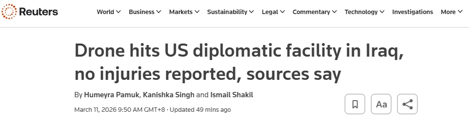 #中东局势#FX168财经报社(亚太)讯 英国路透社周三(3月11日)最新报道称,据一名美国官员以及路透社看到的一份美国国务院内部警报,周二,在美国与以色列对伊朗展开空战之际,一架无人机袭击了美国驻伊拉克的一处重要外交设施。但此次袭击没有造成人员受伤,且所有人员均已确认安全。