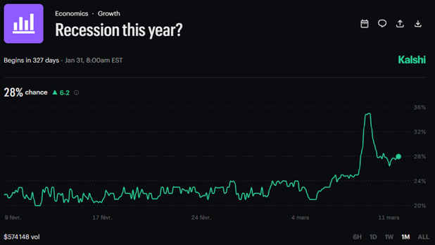 与此同时,Kalshi交易员目前预计,美国在2026年陷入衰退的概率为28%,低于此前34%至36%的近期高点。