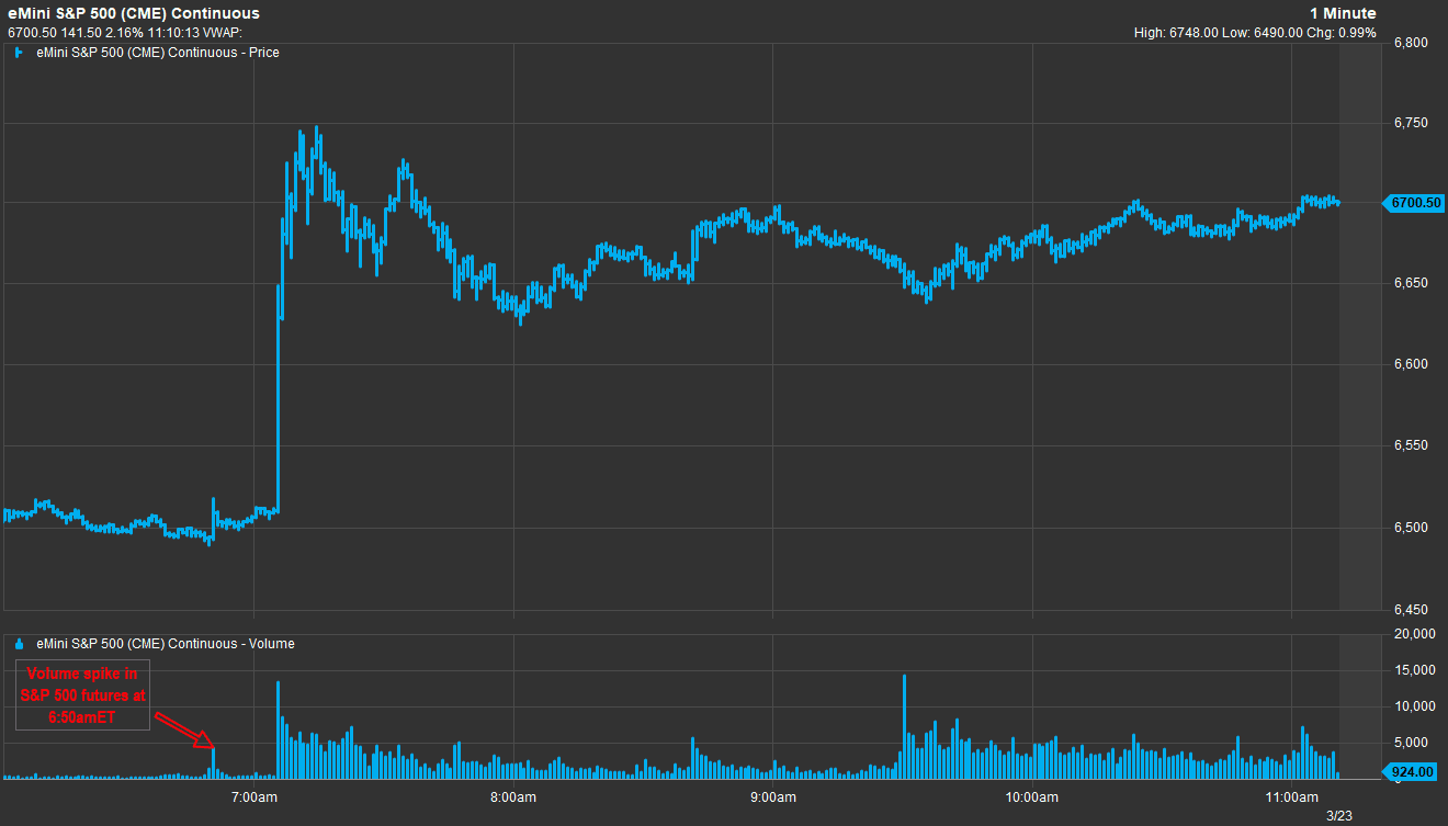 FX168财经报社(北美)讯 美国总统特朗普周一(3月23日)发布有关美伊接触及暂缓打击伊朗能源基础设施的声明后,全球市场迅速剧烈波动:标普500指数期货盘前一度飙升逾2.5%,WTI原油期货则重挫近6%。然而,更引发交易员关注的是,在特朗普发出这则足以撼动市场的帖文前约15分钟,美股股指期货与原油期货已先后出现明显异常放量,令这一敏感时点的交易行为迅速成为市场焦点。有关特朗普推迟对伊朗能源设施打击的表态,以及此后风险资产大涨、油价急跌的走势,已被多家媒体广泛报道。#伊朗危机追踪#