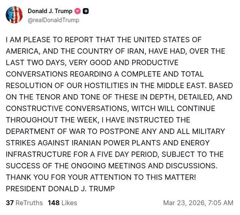 从更广的市场背景来看,特朗普当天的表态本身就足以成为重大价格触发器。此前,美国总统曾就霍尔木兹海峡问题向伊朗发出强硬警告,市场担忧美方可能直接打击伊朗能源与电力系统,从而进一步推高原油价格并拖累全球风险偏好。特朗普随后改口称,将把针对伊朗能源基础设施的打击推迟5天,并表示美伊之间进行了“非常好且富有成效”的沟通,尽管伊朗方面否认存在直接接触。