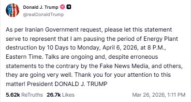 特朗普周四在Truth Social上发文称,应伊朗政府要求,他决定延长当前针对伊朗能源设施的打击暂停期。