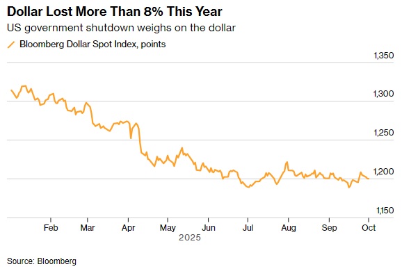 FX168财经报社(亚太)讯 美国彭博社周四(10月3日)报道称,一位顶级外汇货币预测专家表示,随着美国政府关门进入第二天,美元可能会进一步走弱。