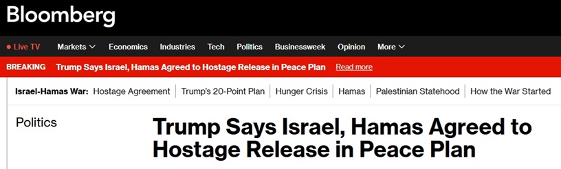 消息人士称,哈马斯已同意加沙停火协议,此外,美国总统特朗普(Donald Trump)表示,以色列与哈马斯已共同接受分阶段和平方案,所有被扣押人员即将获释。美国彭博社称,这是美国斡旋的结束双方两年战争的谈判取得重大突破。