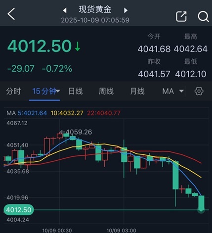 受中东最新消息影响,市场风险偏好情绪迅速升温,现货黄金价格跌至4012美元/盎司附近,日内大跌近30美元。