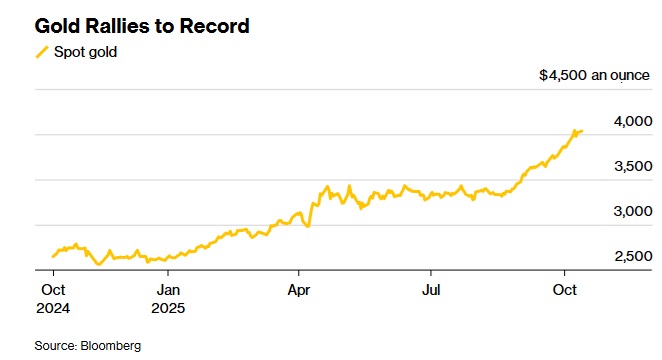 黄金的上涨得益于央行的买盘、交易所交易基金(ETF)持仓的增加以及美联储的降息。贸易紧张局势、美联储独立性受到威胁以及美国政府关门也助长对避险资产的需求。