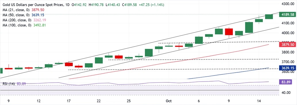 金价稍早触及4193.63美元/盎司,创下历史新高,日内涨幅超过50美元。