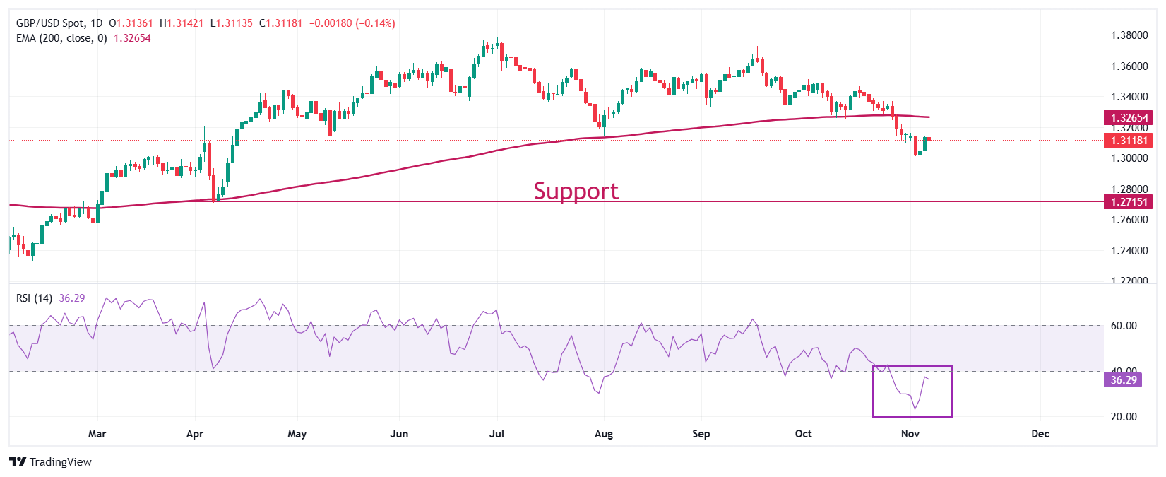 英镑在周五兑美元小幅下跌至接近1.3110。GBP/USD在周二触及的六个月低点1.3000附近保持。该货币对的整体趋势仍然看跌,交易价格低于200日指数移动均线(EMA),该均线约在1.3265。