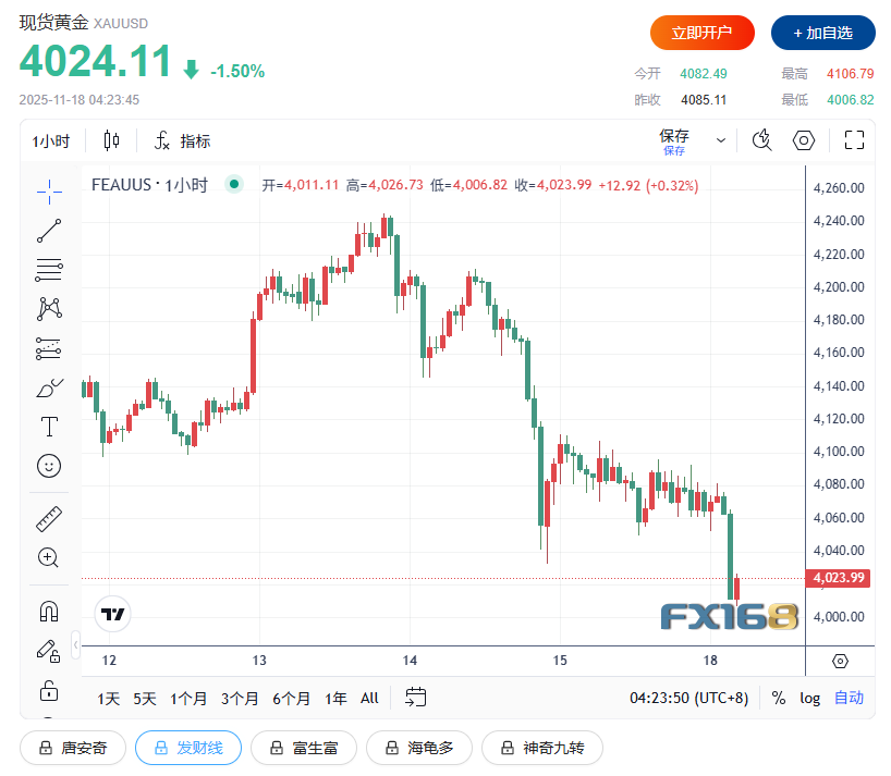 现货黄金短线急跌并刷新日低至4006.82美元/盎司,较日高回落近100美元。