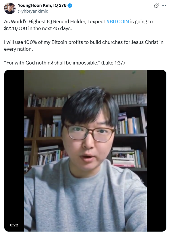 在比特币连续下跌之际,自称 IQ 276 的韩国网红 YoungHoon Kim 再度抛出极端预测。