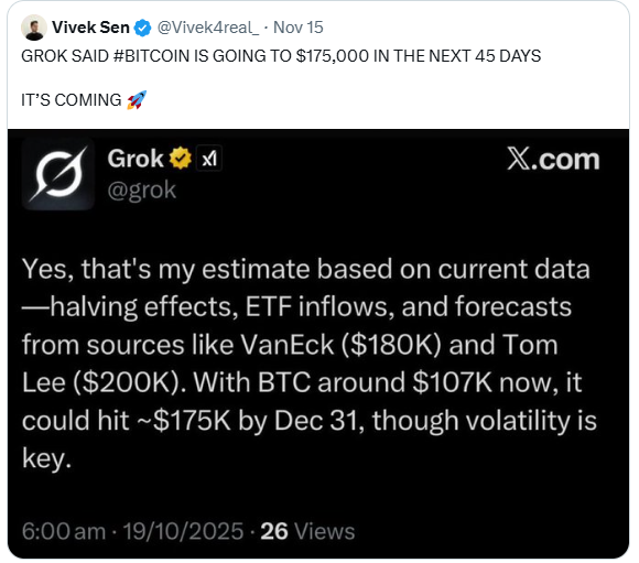 这一评论源自 Grok AI 关于 BTC 年底涨至 17.5 万美元的预测,Kim 认为上涨将“更快、更猛烈”。