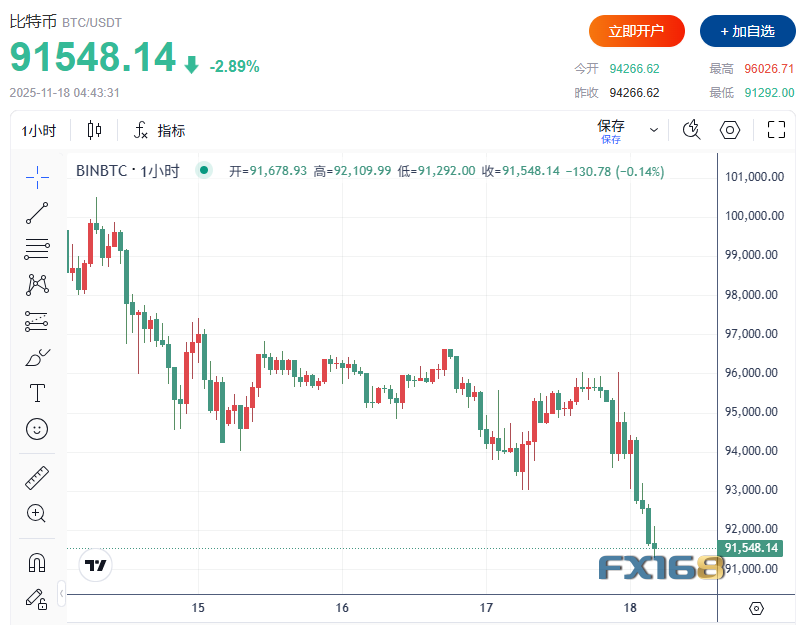 比特币(BTC)周一继续走低,跌至 91,292 美元低点,过去 24 小时下跌约3%,过去一周累计下跌近 13%,回吐了 2025 年全部涨幅,并从一个多月前创下的高点回调 27%。以太坊(ETH)则徘徊在 3,000 美元上方,一周跌幅达 15%。