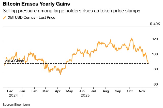 全球最大的加密货币比特币周一下跌至91,500美元以下,加深了今年以来涨幅全数被抹去的抛售。在期权市场上,交易员正押注越来越看空的赌注,坚信跌势远未结束,而资金雄厚的买家正迅速撤退。