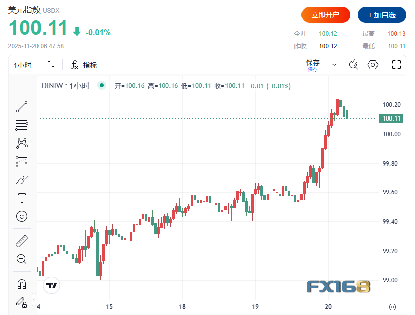 (美元指数小时走势图,来源:FX168)
