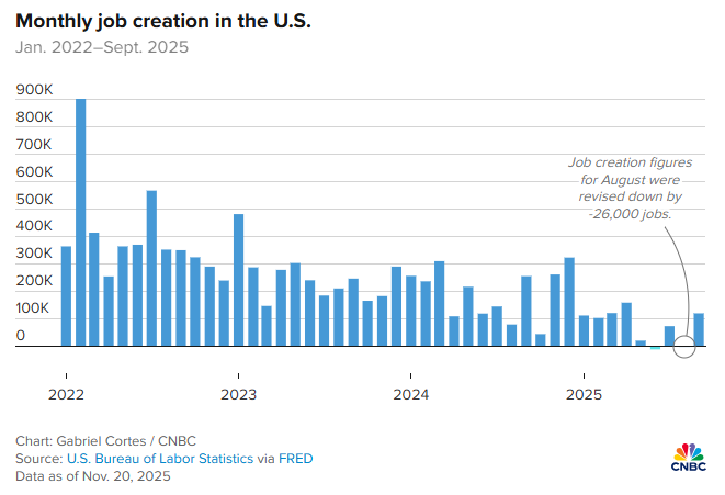 FX168财经报社(北美)讯 在政府停摆造成的统计延误后,美国9月非农就业报告周四(11月20日)终于公布。整体数据呈现“强增长 + 弱质量”的矛盾组合,使市场对美联储12月政策取向的预期骤然复杂化。与此同时,美股在英伟达强劲财报推动下短线大幅拉升,却因降息押注降温而遭遇急速回吐;美元指数重新逼近六个月高位,日元则濒临备受关注的干预区间;加密货币则在短暂的乐观反弹后再次遭遇沉重抛压,行情剧烈震荡。