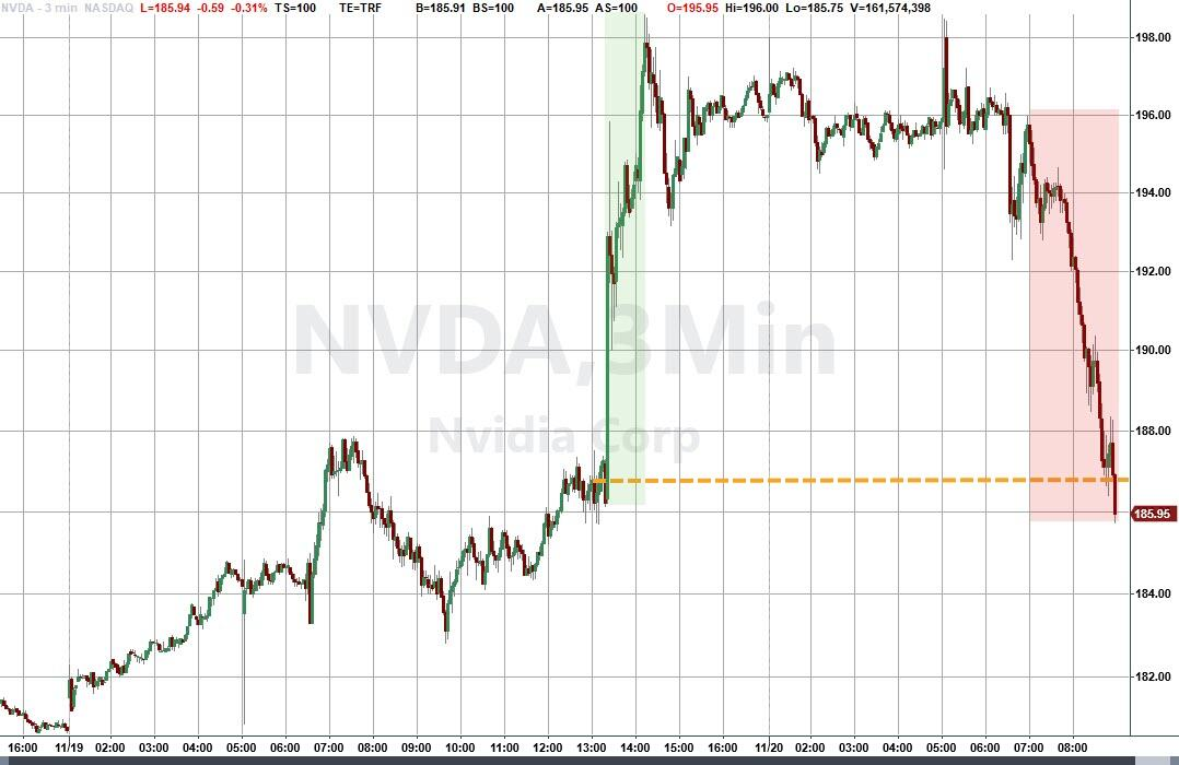 英伟达股价从上涨5%迅速转为下滑,并拖累AMD、Oracle等AI概念股集体走弱。