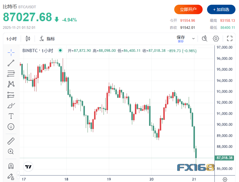 在英伟达财报带动风险资产短线回暖之际,比特币一度突破 93,000美元,但随后迅速遭遇大量抛盘,价格一度回落至86,400美元一线。