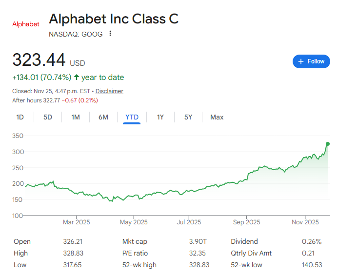 谷歌股价近日迎来强劲拉升,成为本周科技股反弹行情中最为耀眼的明星。周二(11月25日)美市盘中,Alphabet股价上涨1.53%,市值升至约3.9万亿美元,年内涨幅已逼近70%,并在过去六周单独上涨35%,相当于短时间内增加了约1万亿美元市值。