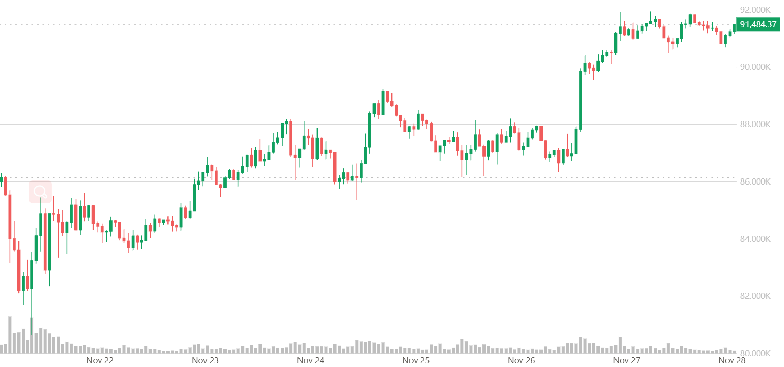 FX168财经报社(亚太)讯 周五(11月28日)比特币继续徘徊在9.1万美元上方,守住前两日的涨幅。比特币近日升破9万美元,主要受到空头回补和逢低买盘推动,而市场对12月降息的预期也在影响行情表现。预测市场显示,比特币在11月可能被压制在约9.2万美元附近,ETF资金外流对上行形成限制。