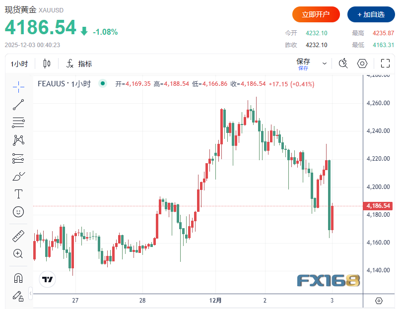 日内稍早,现货黄金短线一度急跌近70美元,刷新日低至 4,163.31 美元/盎司,现回升至 4,186 美元/盎司一线交投。
