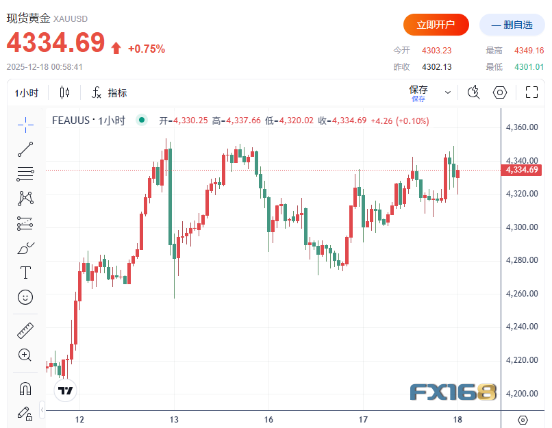 金价亦维持升势,现货黄金上涨 0.4% 至 4,349.16美元/盎司。
