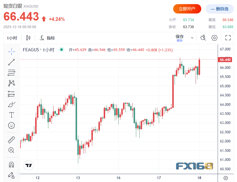 FX168财经报社(北美)讯 周三(12月17日)美盘时段,国际贵金属市场全线走强,其中白银表现尤为突出,价格强势突破65美元关口并再创历史新高。与此同时,美国就业数据不及预期强化了市场对美联储进一步降息的押注,叠加地缘政治风险升温,持续推升贵金属的避险与配置需求。