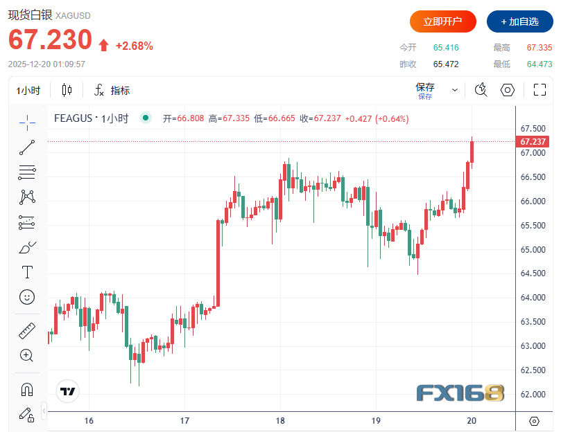现货白银突破67美元/盎司,刷新历史纪录至67.335美元/盎司,日内大涨3%。纽约期银日内涨幅达3%,现报67.18美元/盎司。