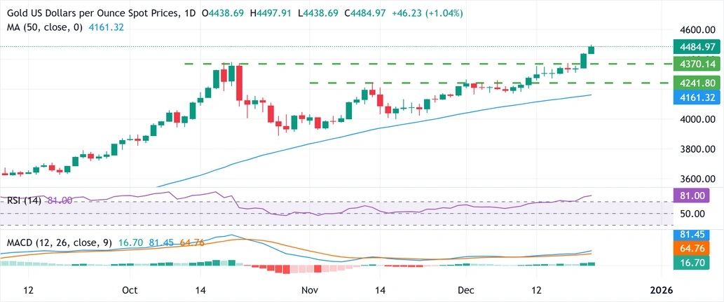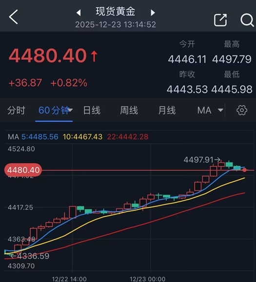#黄金技术分析#24K99讯 周二(12月23日)亚市尾盘,现货黄金维持日内强劲走势,目前金价位于4480美元/盎司附近,金价盘中一度暴涨至4497.91美元/盎司,创下历史新高。FXStreet分析师Haresh Menghani撰文,对金价技术走势进行分析。