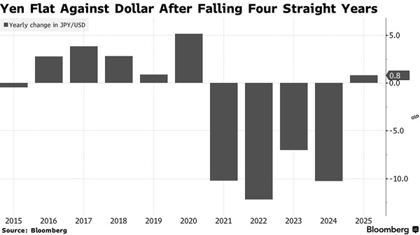 在经历连续四年的下跌后,日元今年迄今兑美元仅勉强录得不到1%的小幅升值;此前市场寄望于日本央行加息与美联储降息带来转机,但实际效果并不理想。