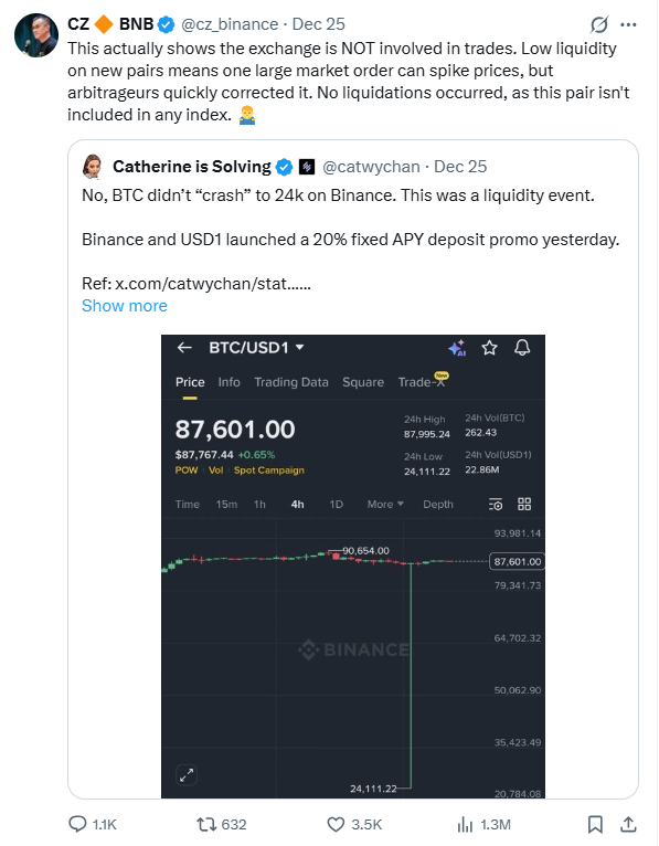 不过,市场随后确认,这并非全市场价格系统性崩盘,而是局限于币安一个相对冷门的交易对——BTC/USD1