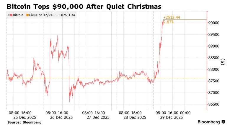 FX168财经报社(亚太)讯 比特币周一(12月29日)上涨并突破 90,000 美元,暗示可能出现向上突破。在股票于圣诞节前后大涨并创下历史新高之际,比特币此前并未跟随出现“圣诞行情”。