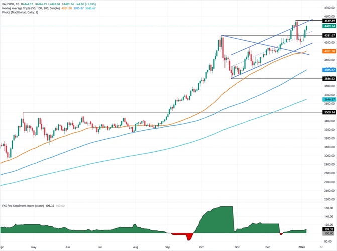 金价前一交易日已大涨近 3%,进一步逼近12月24日创下的历史高点4549.71美元/盎司。