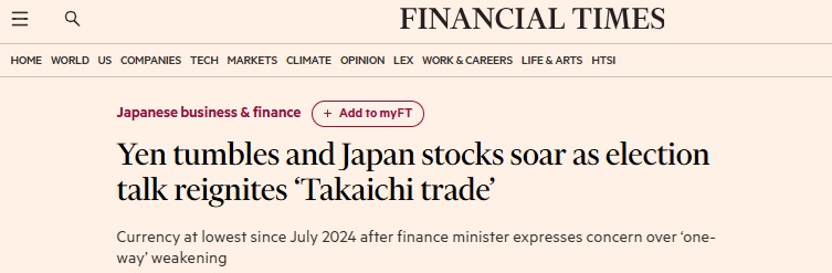 #日本市场##日元贬值#FX168财经报社(亚太)讯 周二(1月13日),随着市场押注下月可能举行的提前大选将再度点燃“高市早苗交易”,日本股市飙升至历史新高,日元则大幅走弱。
