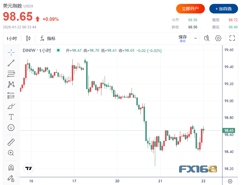 FX168财经报社(北美)讯 美国总统特朗普在世界经济论坛(达沃斯)发表备受关注的讲话时表示,不会动用武力获取格陵兰岛,但希望就其“购买/收购”该岛的意愿“立即展开谈判”。在他对丹麦发出更强硬表态、并将北约负担与关税议题绑定之际,市场对军事冲突风险的担忧阶段性降温,美股三大指数周三(1月21日)全线反弹,美债收益率回落、美元跌幅收窄;与此同时,欧洲方面对反制工具与贸易安排的讨论升温,跨大西洋紧张氛围在达沃斯继续发酵。