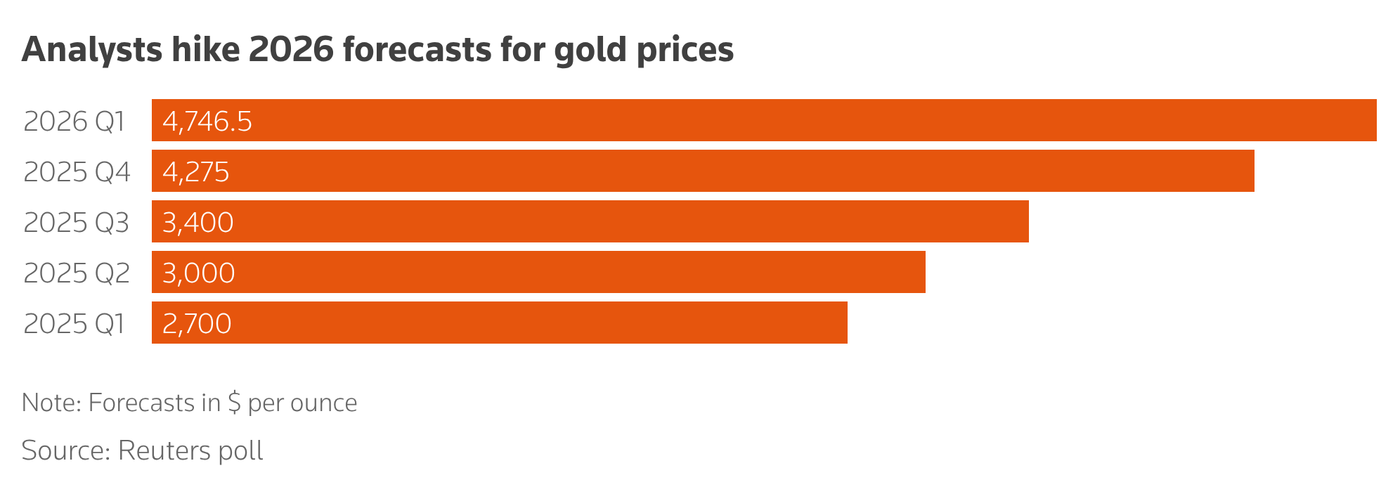黄金近期的强势上涨,促使分析师多次上调预测。一年前,一项类似调查对2026年的平均预测仅为2700美元/盎司